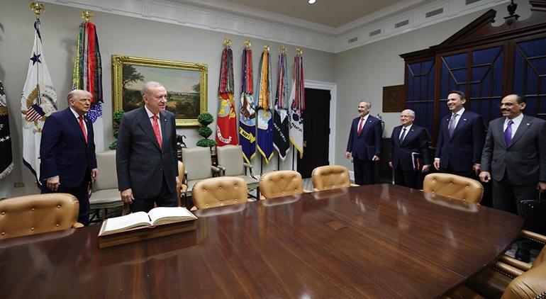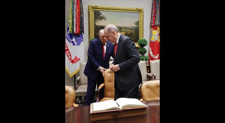 Cumhurbaşkanı Recep Tayyip Erdoğan ile ABD Başkanı Donald Trump arasında Beyaz Saray’da yapılan görüşme sona erdi. Görüşme, 2 saat 20 dakika sürdü. Trump, görüşme sırasında Cumhurbaşkanı Erdoğan’ın anı defterini imzalamak için oturacağı sandalyeyi çekerek jest yaptı.