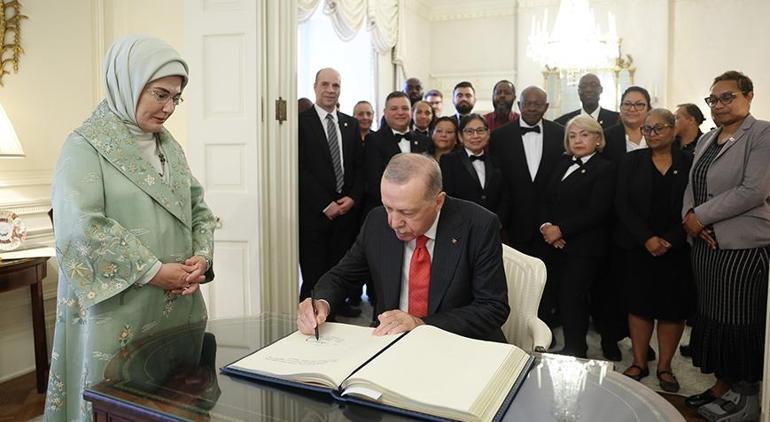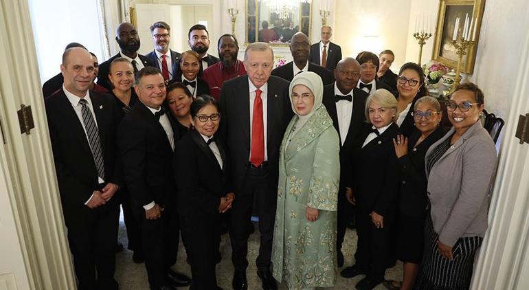 Cumhurbaşkanı Recep Tayyip Erdoğan ile eşi Emine Erdoğan, ABD'nin başkenti Washington DC'de Beyaz Saray'ın karşısında bulunan ve devlet başkanlarının konakladığı Blair House'ta çalışanlarla bir araya geldi.