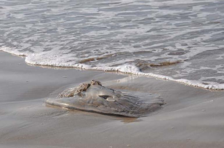 Kum Mahallesi kıyılarında Kızıldeniz'den geldiği değerlendirilen ölü göçmen denizanaları sahile vurarak, bu bölgede yoğunluk oluşturdu.