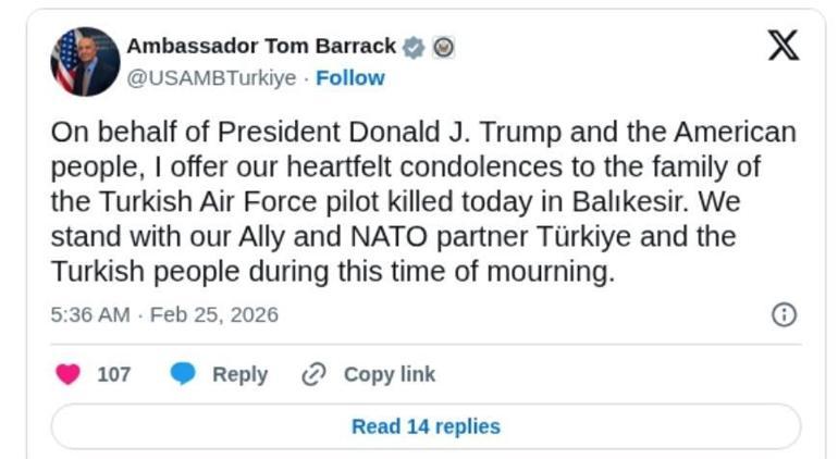 Acı olay sonrası ABD tarafından da taziye mesajı geldi.X sosyal medya hesabı üzerinden paylaşım yapan ABD'nin Türkiye Büyükelçisi ve Suriye Özel Temsilcisi Tom Barrack, ABD Başkanı Trump'ın taziyelerini iletti.