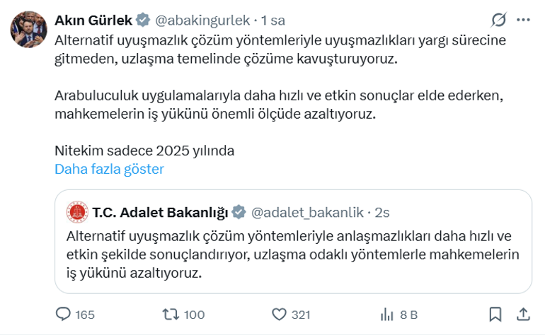 Bakan Gürlek, NSosyal hesabından yaptığı paylaşımda, alternatif uyuşmazlık çözüm yöntemleriyle uyuşmazlıkları yargı sürecine gitmeden, uzlaşma temelinde çözüme kavuşturduklarını belirtti.