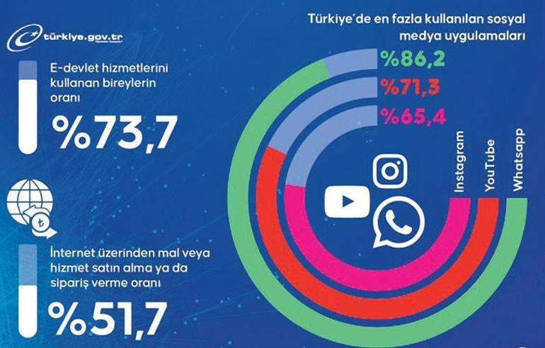 En fazla kullanılan sosyal medya ve mesajlaşma uygulamaları yüzde 88.6 ile WhatsApp, yüzde 72.9 ile YouTube ve yüzde 68.1 ile Instagram oldu. Erkeklerin en fazla yüzde 91.3 ile WhatsApp, yüzde 75.7 ile YouTube ve yüzde 68.7 ile Instagram, kadınların yüzde 85.9 ile WhatsApp, yüzde 70.1 ile YouTube ve yüzde 67.4 ile Instagram uygulamalarını kullandığı belirlendi.