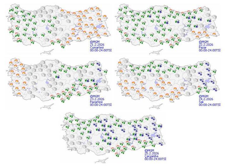 Meteoroloji Genel Müdürlüğü olarak yapılan değerlendirmelere göre: Ülkemizin batı kesimlerinin parçalı ve çok bulutlu, Trakya kesimi, Ege kıyıları ile Çanakkale çevrelerinin yağmur ve sağanak yağışlı, diğer yerlerin az bulutlu ve açık geçeceği tahmin ediliyor. Sabah saatlerinde iç ve doğu kesimlerde buzlanma ve don olayı bekleniyor. Doğu Karadeniz’in iç kesimlerinin yüksekleri ile Doğu Anadolu’nun doğusunda yüksek kar örtüsüne sahip eğimli kesimlerinde çığ ve kar erimesi tehlikesi bulunmaktadır.
