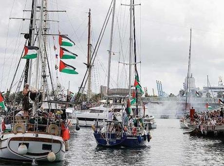 Filoyu yolcu etmek üzere limanda toplanan yüzlerce Tunuslu, filoya ve Gazze'ye destek mesajları verdi.