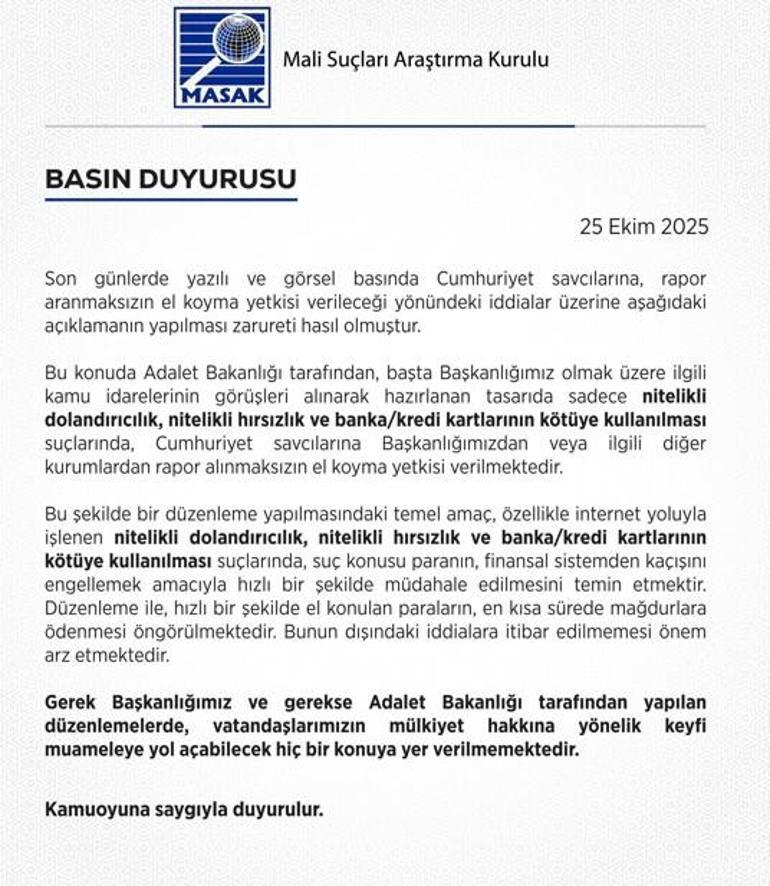 Açıklamada, Cumhuriyet savcılarına bu suçlar kapsamında, MASAK veya ilgili diğer kurumlardan rapor alınmaksızın el koyma yetkisi verildiği ifade edilerek, “Bu düzenlemenin temel amacı, özellikle internet üzerinden işlenen nitelikli dolandırıcılık, nitelikli hırsızlık ve banka/kredi kartlarının kötüye kullanılması suçlarında suç gelirlerinin finansal sistemden kaçmasını önlemek ve mağdurların zararlarının hızlı şekilde giderilmesini sağlamaktır.” denildi.