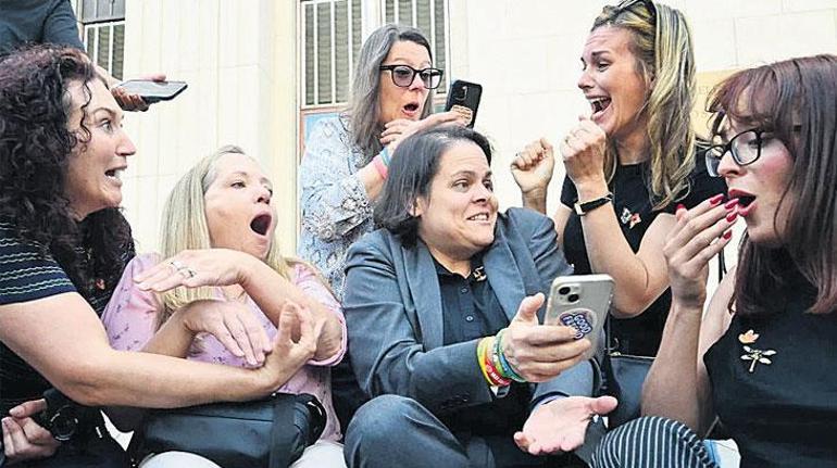 Aileler,Los Angeles Yüksek Mahkemesi önünde mağdurların isimlerinin listelendiği bir afiş açtı ve karar sonrası birbirlerine sarılarak kararı kutladı.