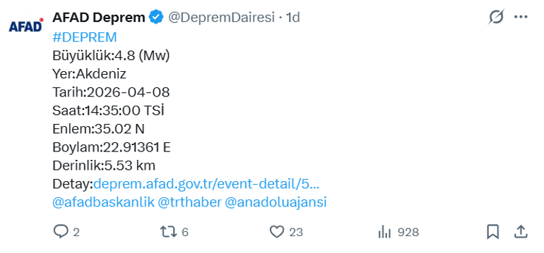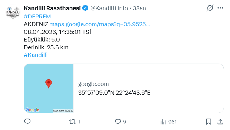 Kandilli Rasathanesi’nin verilerine göre ise Akdeniz’de deprem büyüklüğü 5.0 olarak kaydedildi. Sarsıntının 25.6 kilometre derinliğinde gerçekleştiği ifade edildi.