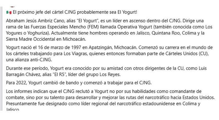 Abraham Jesús Ambriz Cano, nam-ı diğer “El Yogurt”, Meksika uyuşturucu kartelleri dünyasında hızla yükselen bir isim. Mencho Özel Kuvvetleri (Fuerzas Especiales Mencho – FEM) içinde Operativa Yogurt (ya da Los Yogures, Yoghuriza) adlı bir kolu yönetiyor. Jalisco, Quintana Roo, Colima ve Michoacán bölgesinde aktif görev alıyor.
