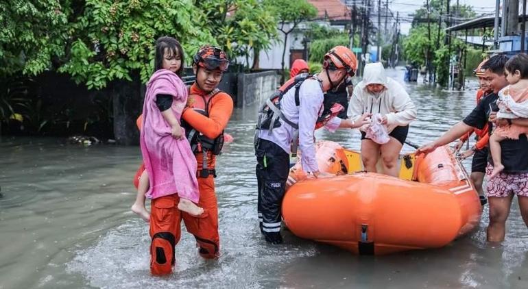 Bazı noktalarda diz boyuna ulaşan sel suları nedeniyle Legian’daki en ağır etkilenen bölgelerde yaşayanlar sal ve botlarla tahliye edildi.