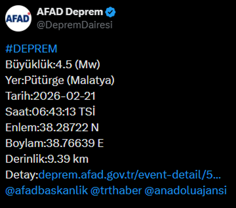 Afet ve Acil Durum Yönetimi Başkanlığının (AFAD) internet sitesinde yer alan bilgiye göre, saat 06.43’te merkez üssü Pütürge olan 4,5 büyüklüğünde sarsıntı kaydedildi.