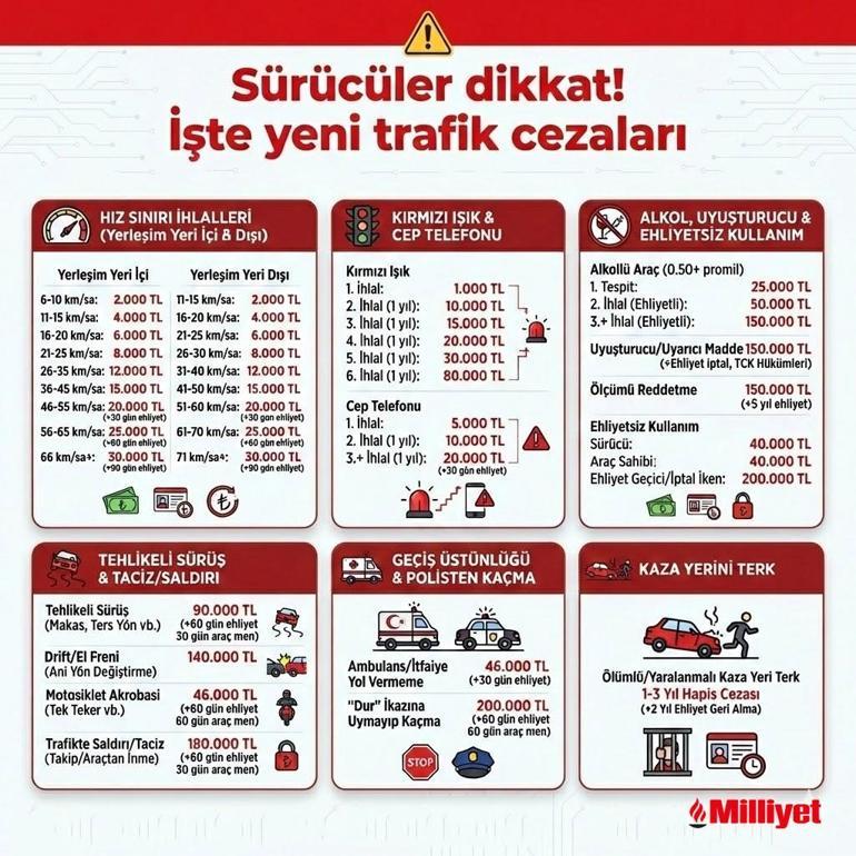 Hız sınırlarını yerleşim yeri içinde, 6-10 kilometre/saat aşanlara 2 bin lira, 11-15 kilometre/saat aşanlara 4 bin lira, 16-20 kilometre/saat aşanlara 6 bin lira, 21-25 kilometre/saat aşanlara 8 bin lira, 26-35 kilometre/saat aşanlara 12 bin lira, 36-45 kilometre/saat aşanlara 15 bin lira, 46-55 kilometre/saat aşanlara 20 bin lira, 56-65 kilometre/saat aşanlara 25 bin lira, 66 kilometre/saat ve daha fazlasını aşanlara 30 bin lira idari para cezası verilecek.
