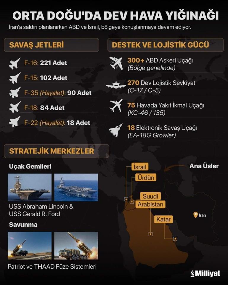 Son haftalarda F-35, F-22, F-15 ve F-16’lar dahil olmak üzere düzinelerce ABD savaş uçağının, çok sayıda yakıt ikmal uçağı ve yüzlerce askeri kargo uçağıyla birlikte Orta Doğu’ya sevk edildiğinin gözlemlendiği kaydedildi.